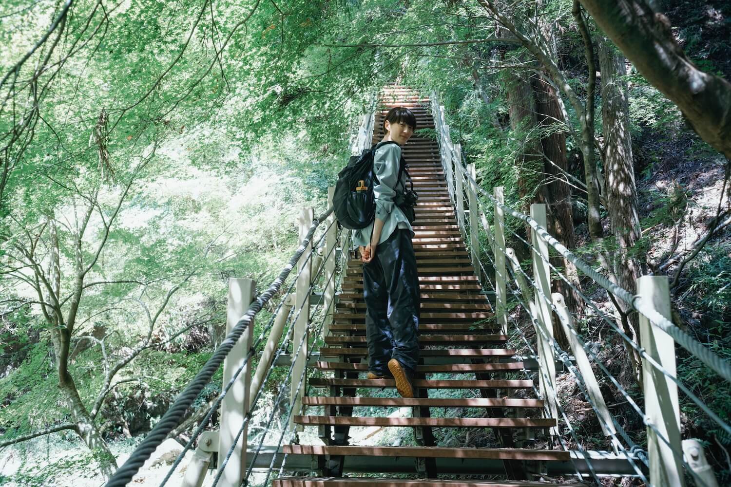 甲府駅から約1時間程車を走らせ向かうのは、富士川町・大柳川渓谷(おおやながわけいこく)。バッジキャンペーンの獲得ランドマークのひとつでもあるこの場所は、ライトハイキングも楽しめる極上の癒しスポット。山上集落の細い道を抜けると、清流の音が心地よく響きます。