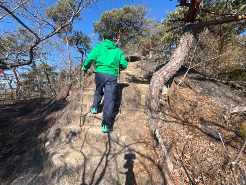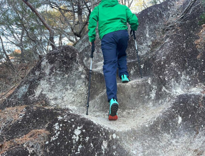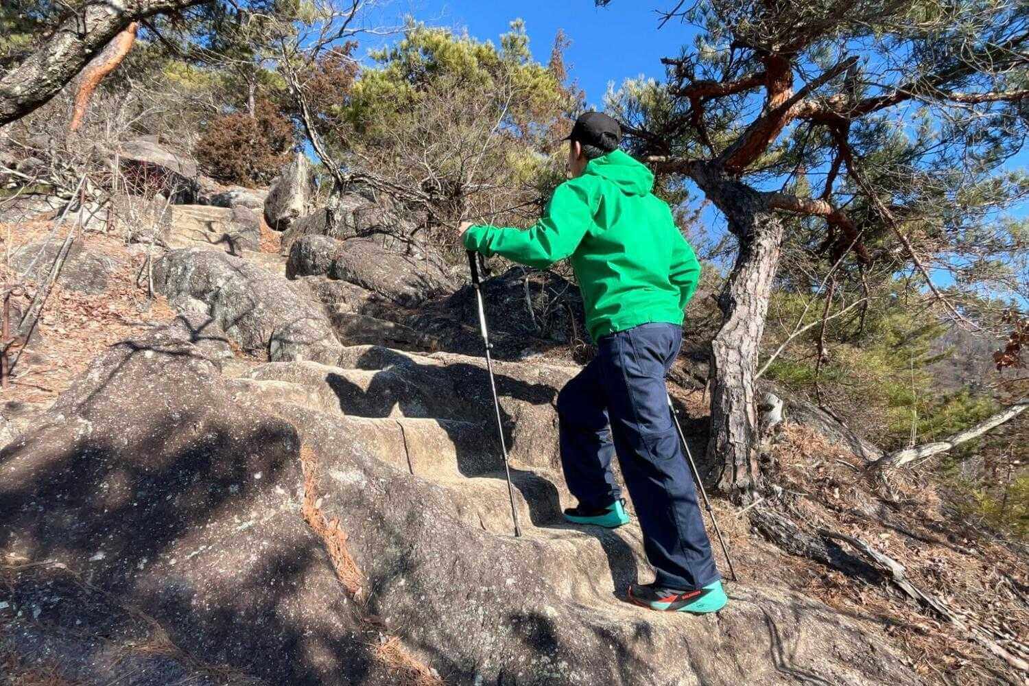 トレッキングポールを使う登山者は、段差の高さに応じて自然と歩き方を使い分け、「四足歩行の本能」が呼び覚まされている──。