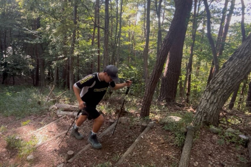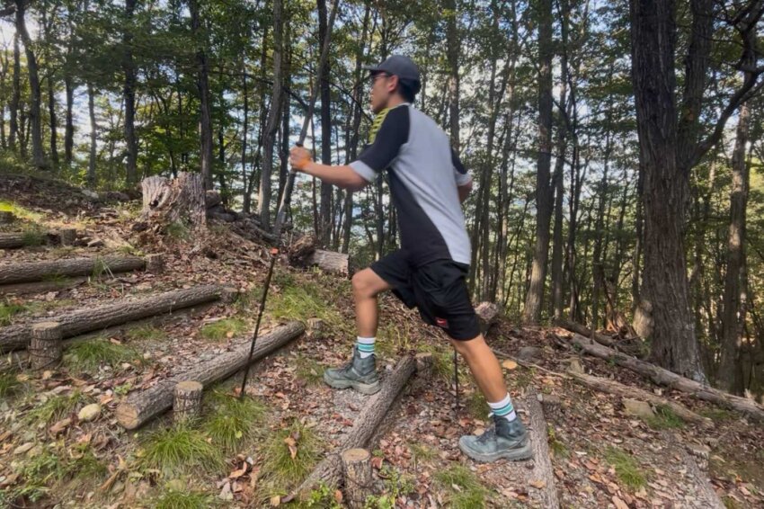 参加者は、山梨の「湯村山・八王子山」、全長4.2kmのコースを実際に登山。コース上には高さ約20cmの比較的低い階段と、高さ約40cmの高い岩段が混在しており、登山の前半と後半では疲労度も大きく異なります。